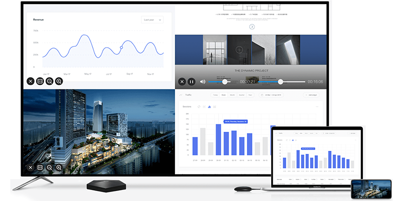 MAXHUB 传屏盒子可将电脑、手机或平板画面投至大屏。