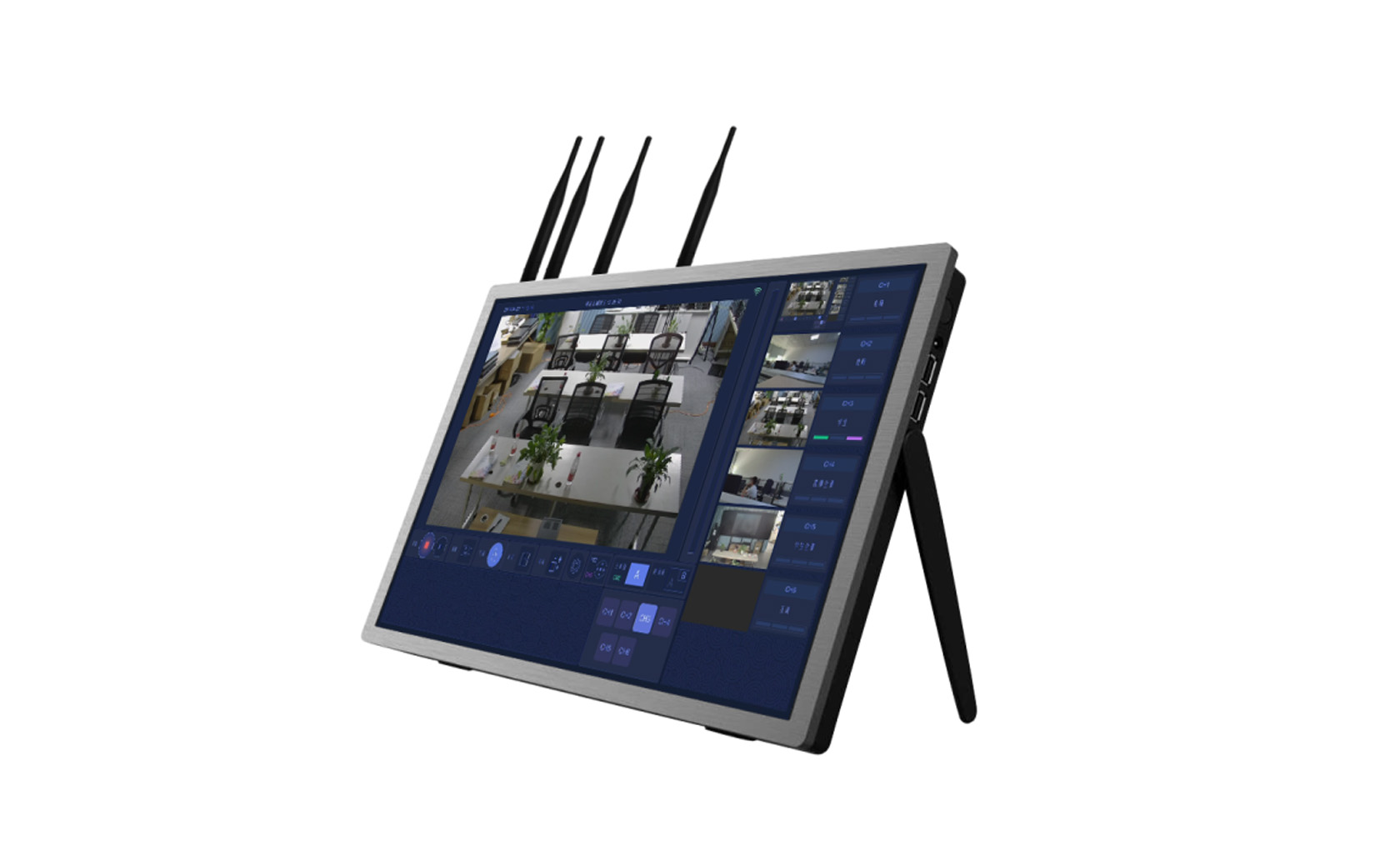 DC_IN — 标准19V电源输入接口 网口 — 1路RJ45网络接口,为录播主机主网口,具有物联网功能。(默认IP:192.168.1.55) HDMI-OUT — 1路HDMI电影特效画面视频或互动视频输出 HDMI-IN — 1路HDMI视频输入接口 AUDIO — 1路3.5mm线性音频输出接口 LINE IN — 1路3.5mm线性接口音频输入 无线MIC — 1路3.5mm线性接口无线MIC音频输入 后面板USB — 1路USB 2.0接口,可连接USB键盘、鼠标等 侧面板USB — 2路USB 3.0接口,可连接鼠标、键盘、USB硬盘做录像文件备份、系统升级用 无线5G接口 — 2路无线5G网络传输天线; 无线wifi接口 — 1路无线wifi AP功能 无线4G接口 — 1路无线4G网络传输天线